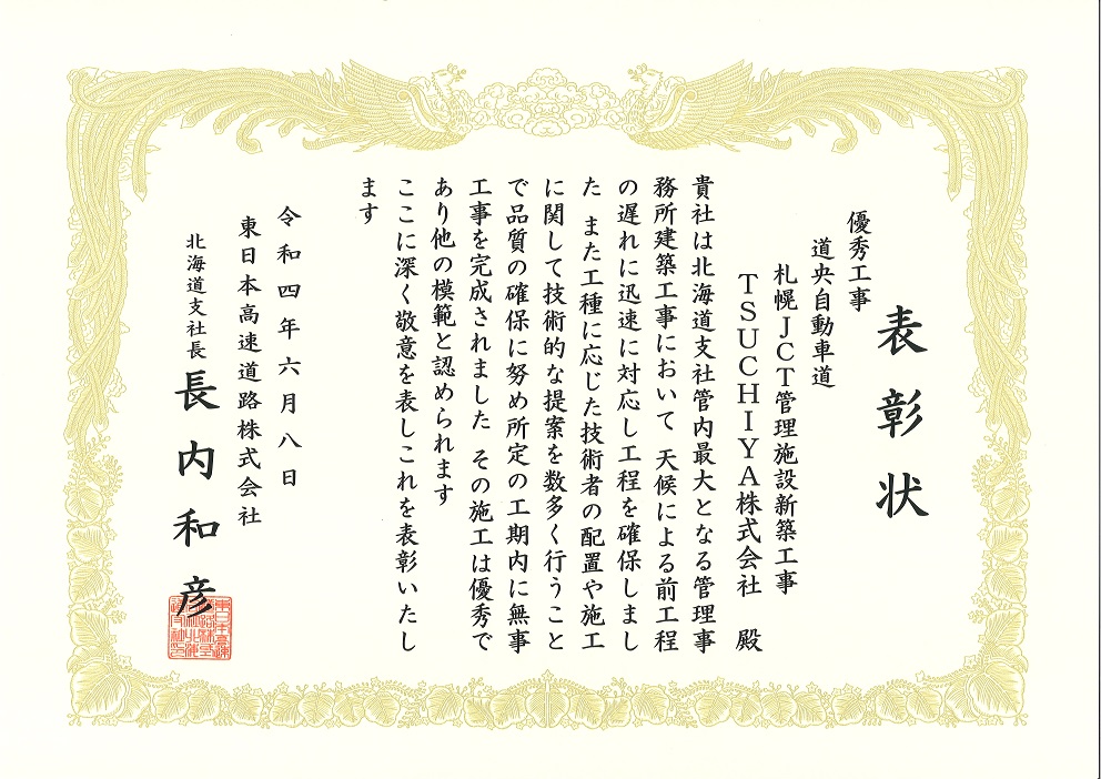 東日本高速道路株式会社北海道支社より優秀工事表彰を頂きました。
