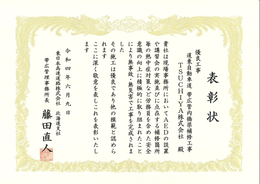 2022年6月8日、9日に東日本高速道路株式会社北海道支社支社長 長内和彦様より支社長表彰、帯広管理事務所所長 藤田直人様より事務所長表彰を頂きました。