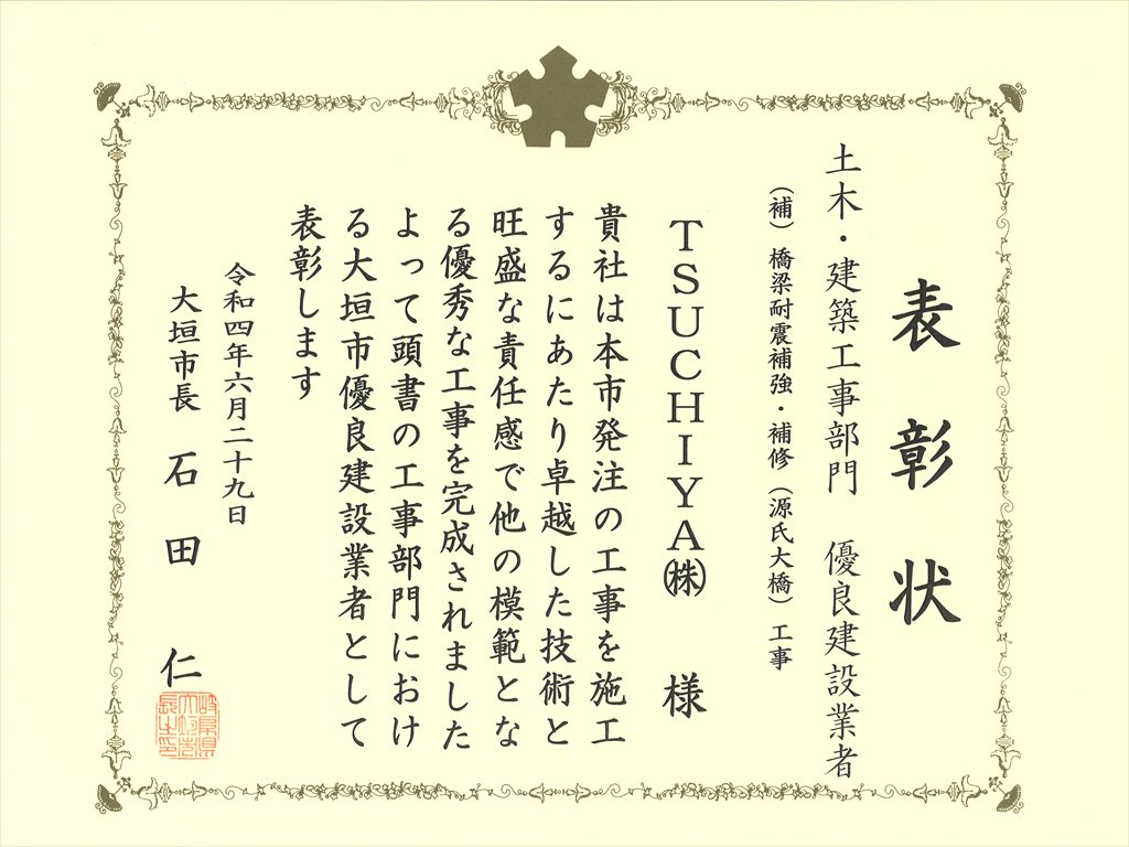 2022年6月29日に大垣市長 石田 仁様より優良建設業者表彰を頂きました。これは下記の工事における技術力を評価していただいたものです。