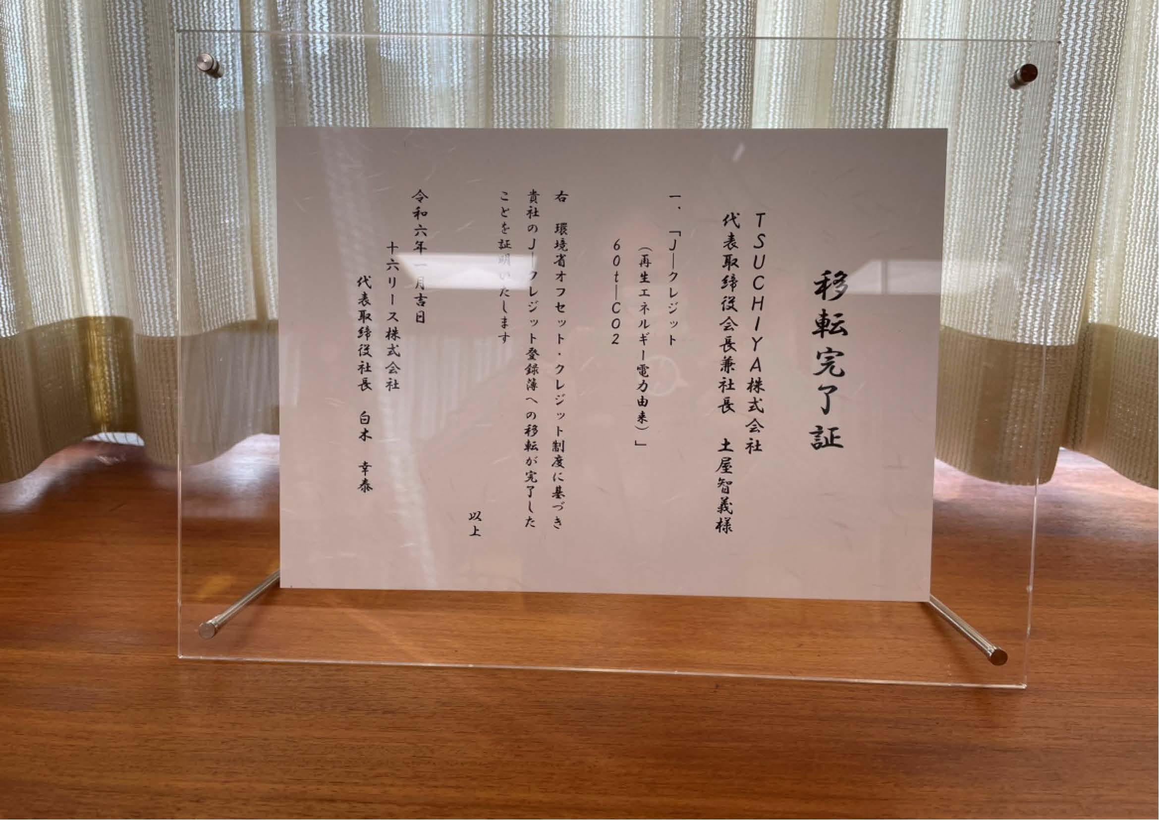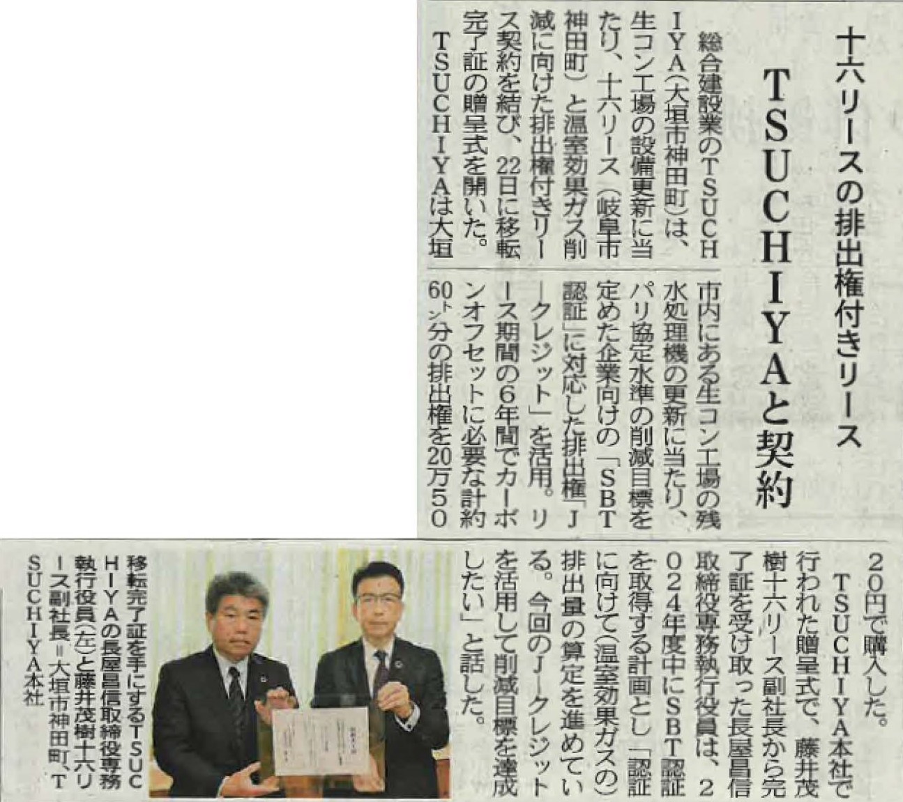 今回は大垣市内にある当社の生コンクリート工場の残水処理施設から排出されるCO2を、排出権を売買できる制度J―クレジットを使って埋め合わせることで、実質CO2排出量ゼロを実現する仕組みとなります。今回は算出した排出量を基に、十六リース株式会社が「J―クレジット」60トン分を購入し、排出権を当社に移転する内容で、1月22日に大垣本店で「移転完了証」の贈呈式が執り行われました。