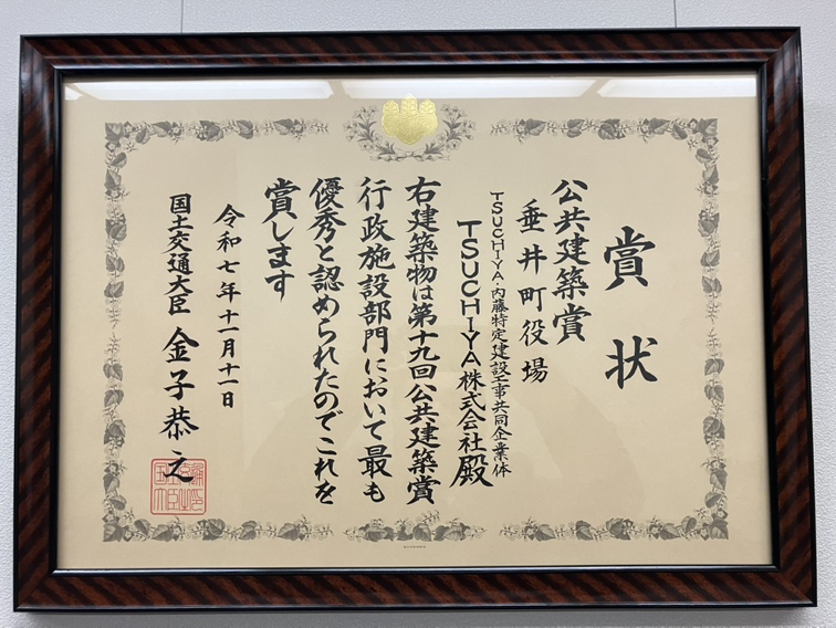 2025年10月10日に開催された「第19回公共建築賞」(主催:一般社団法人公共建築協会・一般財団法人建築コスト管理システム研究所)において、当社が施工を担当した垂井町新庁舎建設工事が、行政施設部門で公共建築賞を受賞しました。