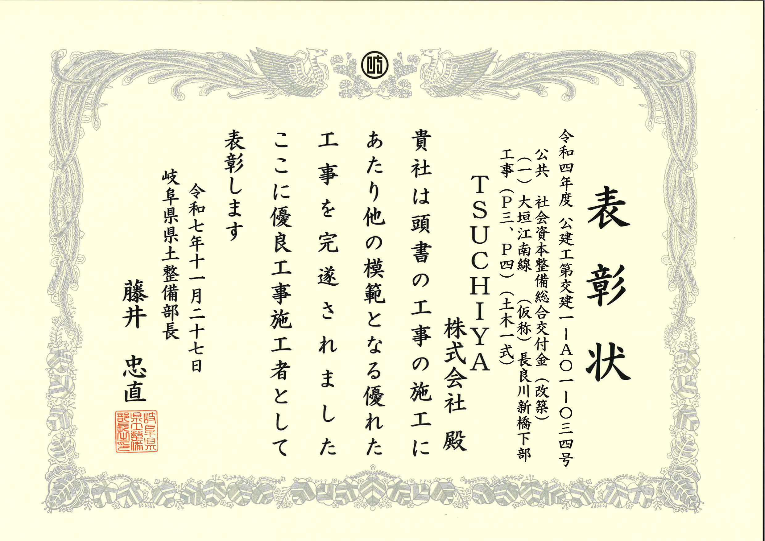 2025年11月27日に岐阜県県土整備部長 藤井 忠直様より優良工事施工者表彰をいただきました。これは下記の工事における品質を評価していただいたものです。